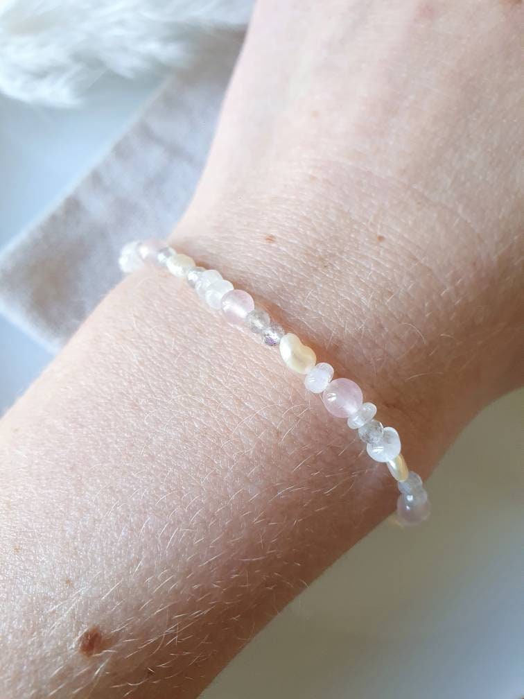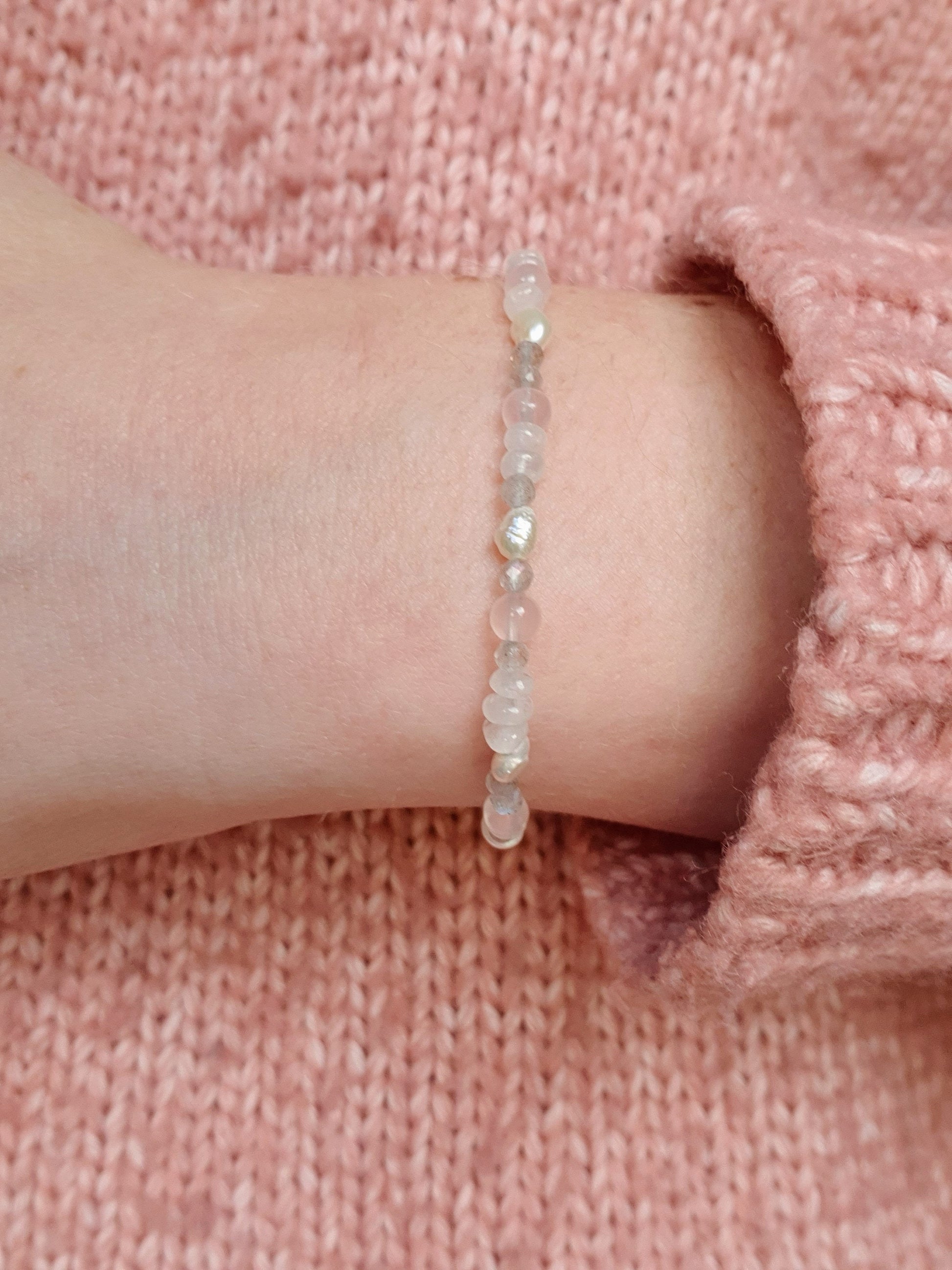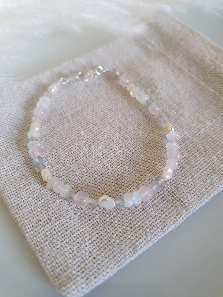 Say hello to this beautiful gemstone bracelet made with rainbow moonstone, labradorite, baroque freshwater pearl and rose quartz.