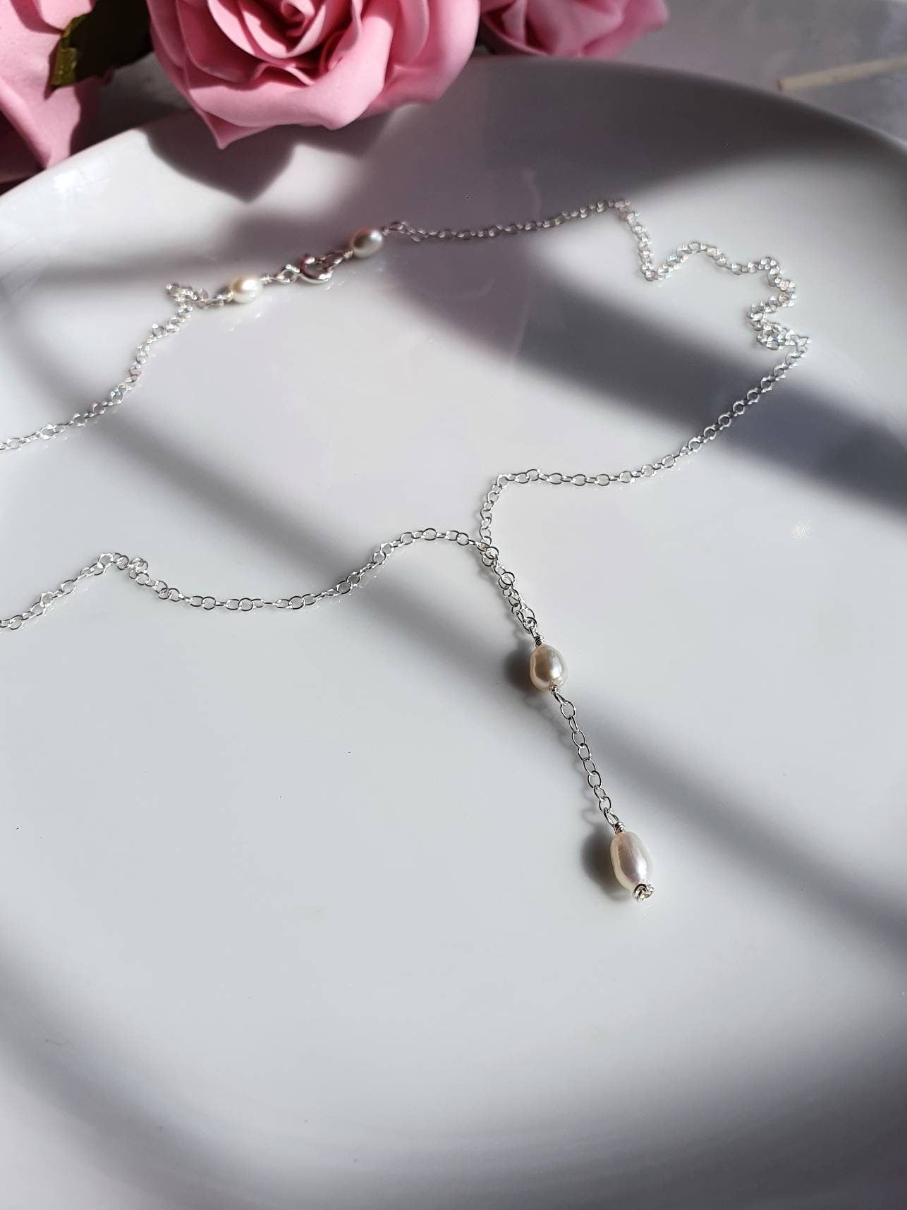 The necklace photographed is 18 inches and the bottom of the drop is approximately an extra inch. Please note each necklace is made to order and will look slightly different due to the and the organic nature of the pearls and handmaking process. This makes your necklace unique to you!