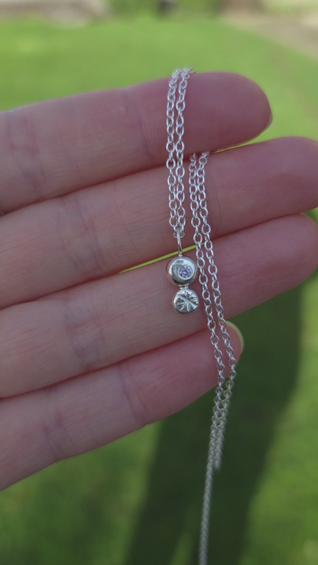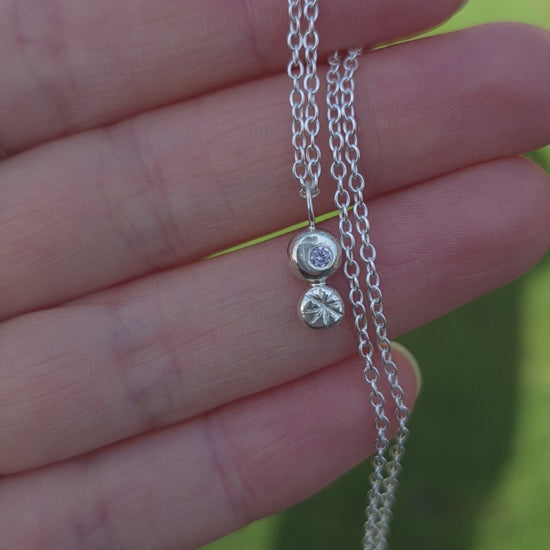 My pebble pendants are made by melting down pieces of surplus silver from my workshop to form unique pebbles. This pebble is flush set with a tiny (2mm) pink cubic zirconia stone and a hand carved star.