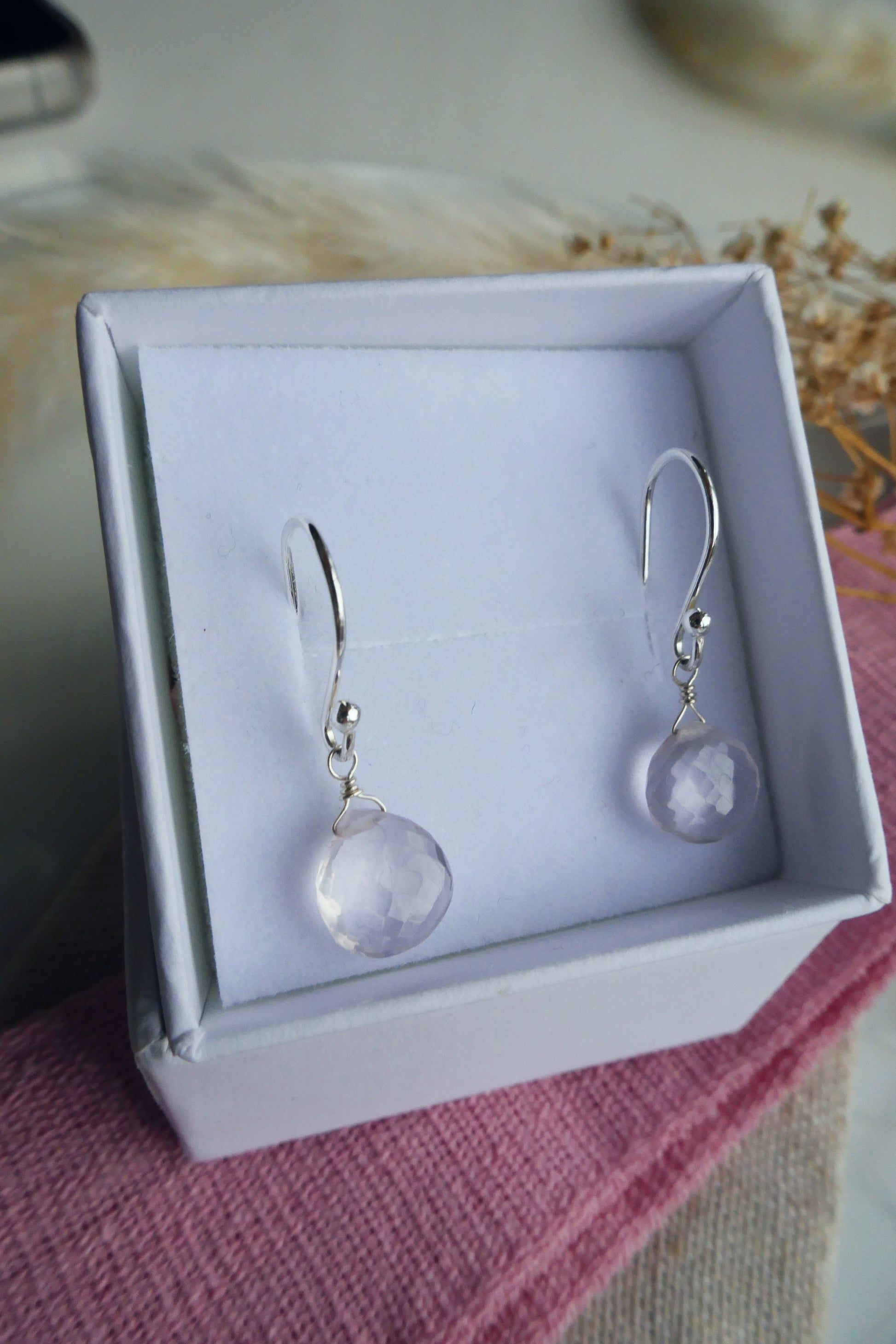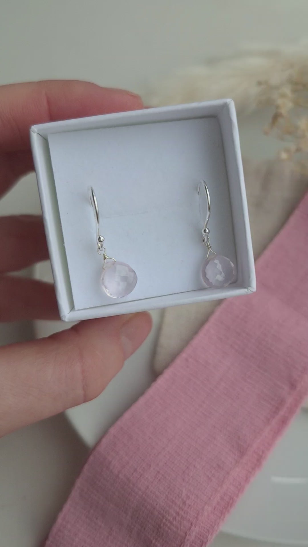 Earrings made with beautiful rose quartz briolette gemstones with near perfect clarity.