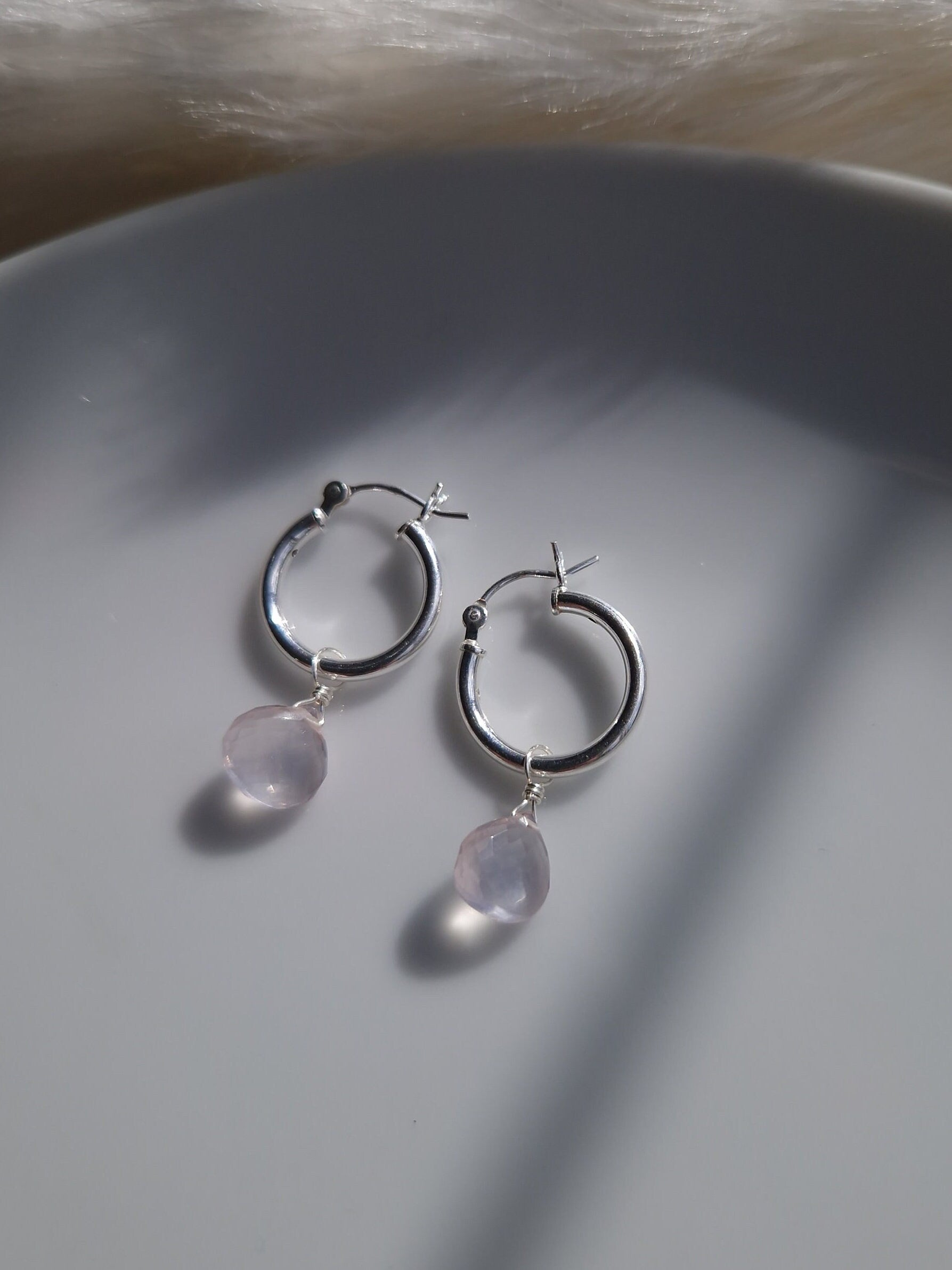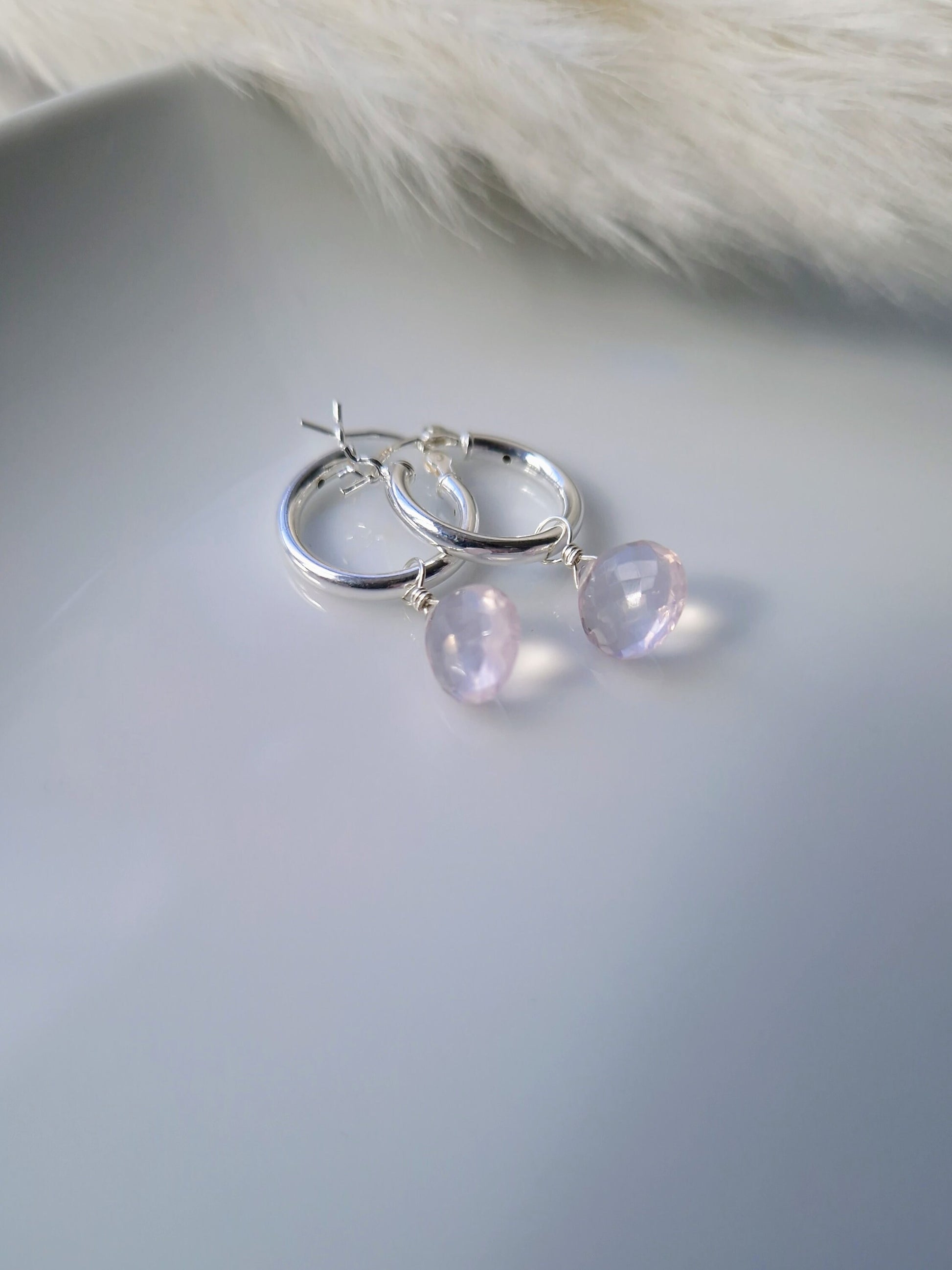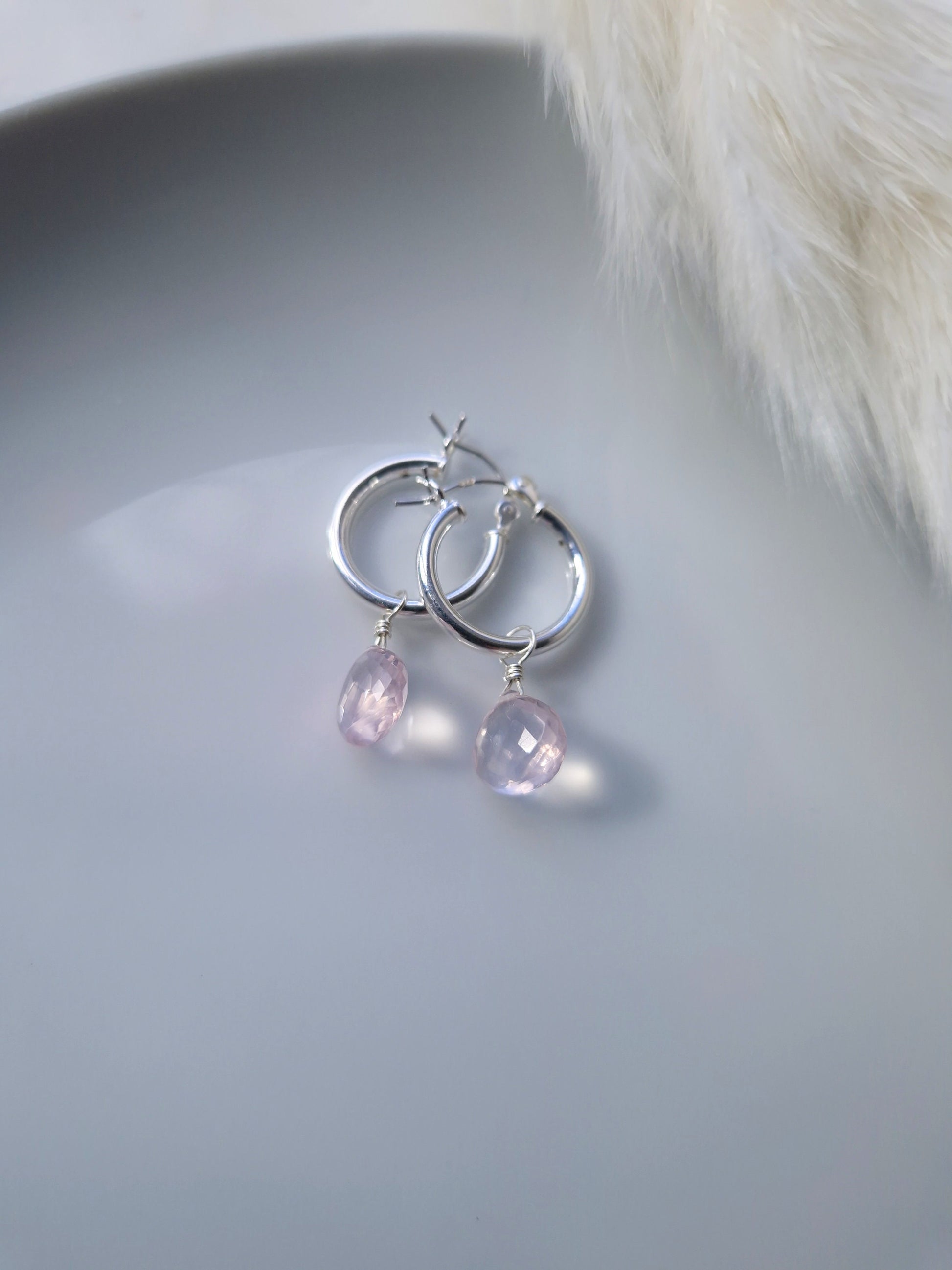 Made with faceted rose quartz briolette beads (approximately 9mm) and sterling silver hinged clasp hoops. The charms can be detached from the hoops for a more minimalist look.