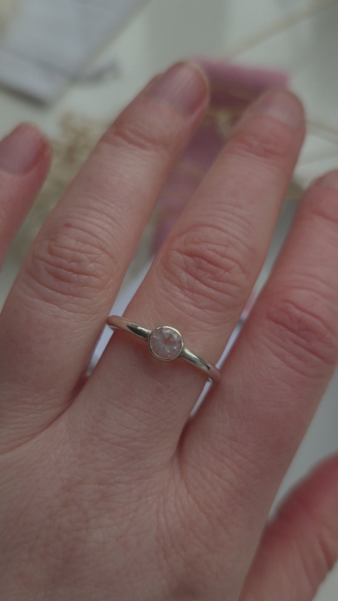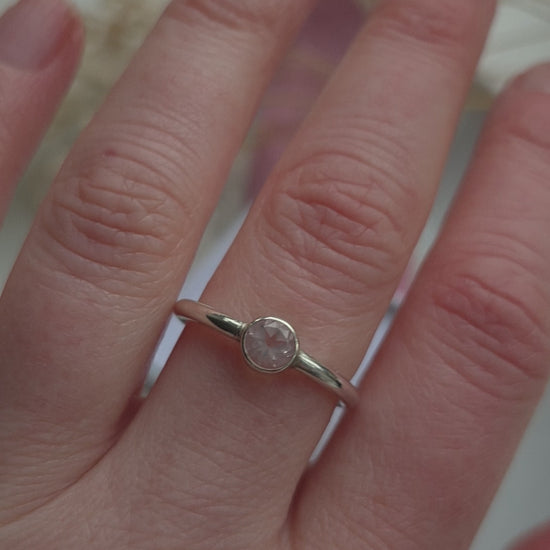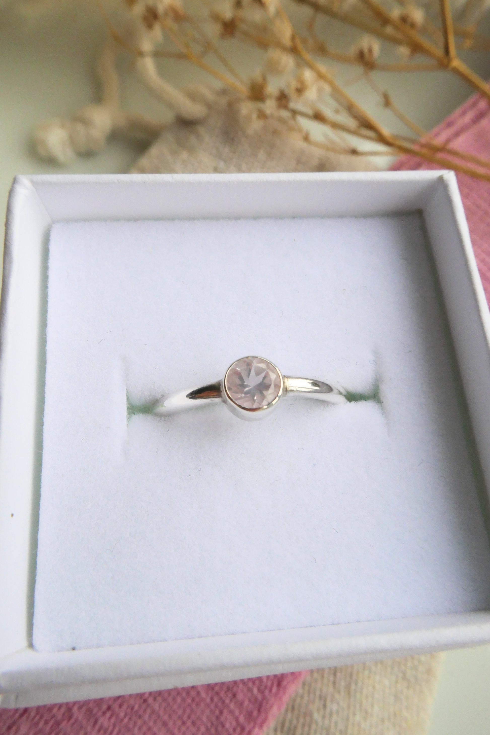A beautiful ready to ship ring made with a faceted rose quartz gemstone set into a 1.5mm smooth band.